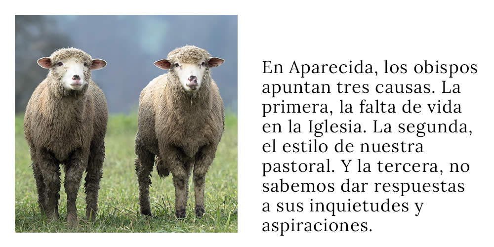 Hoy todos estamos llamados a hacernos una seria reflexión, la relación entre pastores y fieles. Y un tema que hoy no debiera olvidarse: ¿Qué sucede para que hoy tantas ovejas dejen el rebaño de la Iglesia y se salgan a buscar pastos en otros campos? Lo más fácil es culpar a los que nos dejan y abandonan la Iglesia. ¿No será el momento de que seamos nosotros quienes debamos asumir conciencia de qué nos está sucediendo para que se nos vayan? ¿Qué es lo que no encuentran entre nosotros y creen encontrarlo fuera? Permítanme leerles lo que los Obispos reunidos en la V Asamblea General del CELAM en Aparecida (Brasil) dijeron, porque creo es una confesión sincera y comprometedora para todos.